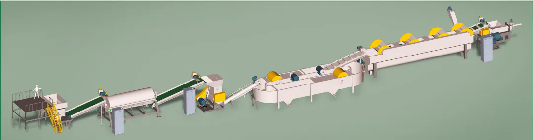 此套生產(chǎn)線有效解決了廢舊薄膜(農(nóng)膜、地膜、包裝膜、垃圾膜等)清洗過程工程量和耗水量偏大的問題,研發(fā)了一套專門針對(duì)農(nóng)膜地膜類泥沙含量高的破碎清洗處理線,很大程度的提高了產(chǎn)能,降低了水耗和電耗。整套設(shè)備從拆包到粗碎-除沙-細(xì)碎-清洗-脫水-造粒均可全自動(dòng)化流水生產(chǎn),生產(chǎn)出來的成品顆?;具_(dá)到了新料的品質(zhì),廣泛用于吹膜、注塑擠出、回收造粒等領(lǐng)域。